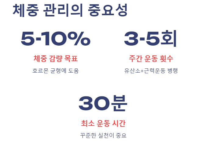 - 체중 관리: 체중의 5~10%만 줄여도 호르몬 균형에 도움이 돼요.