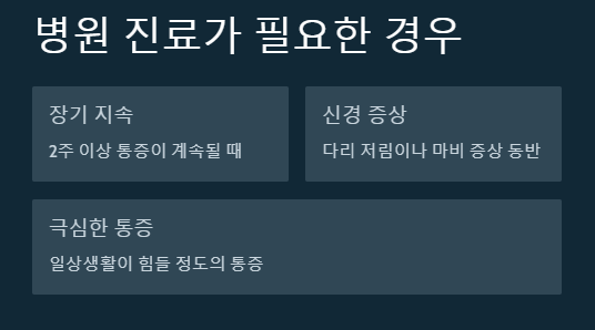 가벼운 허리통증은 스트레칭이나 휴식으로도 완화되지만, 다음과 같은 경우라면 병원 진료를 받아보는 것도 좋아요.
