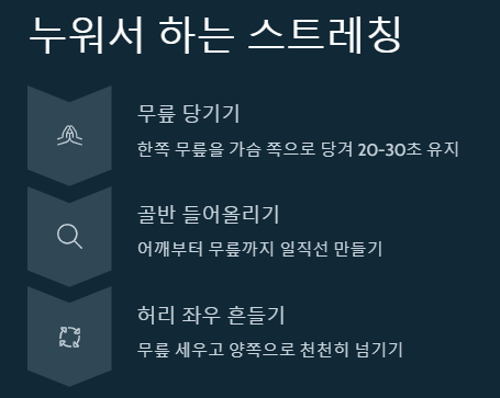 바쁜 일상 속에서 꾸준히 할 수 있는 간단한 스트레칭부터 시작해 보면 어떨까요? 누워서 할 수 있는 동작들이라 허리에 큰 부담도 없어요.