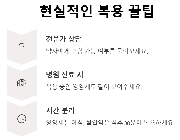 특히 영양제 복용 간격은 1~2시간 이상 띄우는 게 안전해요.