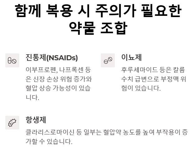 | 진통제(NSAIDs) | 이부프로펜, 나프록센 | 신장 손상 위험 증가, 혈압 상승 가능성 |