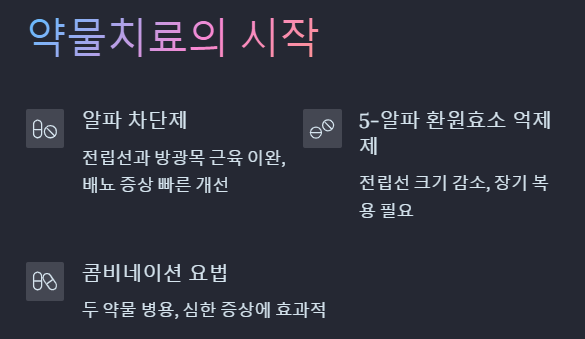 | 5-알파 환원효소 억제제 | 전립선 크기 감소 유도 | 장기 복용 시 효과, 성기능 부작용 가능 |