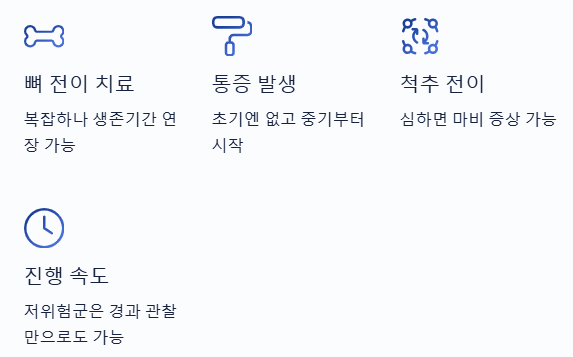 전립선암은 진행되면 뼈로 전이되는 경우가 매우 흔한 암이에요. 특히 척추, 골반, 대퇴부 쪽으로 전이가 잦고, 이때부터 다음과 같은 변화들이 나타날 수 있어요.