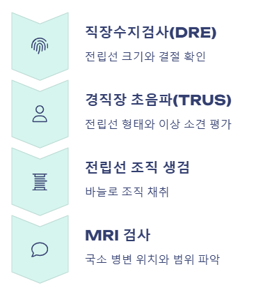 - 직장수지검사(DRE): 항문을 통해 전립선 크기와 결절 여부 확인