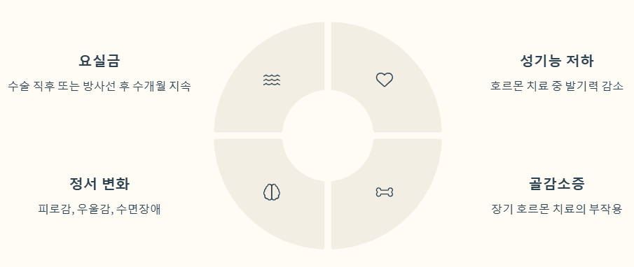 - 요실금: 수술 직후 또는 방사선 후 수개월 지속 가능