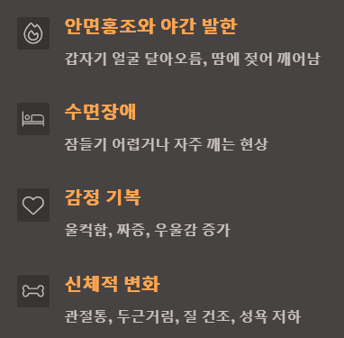 가장 흔한 증상은 안면홍조와 야간 발한이에요. 갑자기 얼굴이 달아오르거나 자다 말고 땀에 젖어 깨어나는 경우죠. 이 외에도 수면장애, 감정 기복, 관절통, 두근거림, 가슴 통증, 질 건조, 성욕 저하 등 증상이 정말 다양해요.