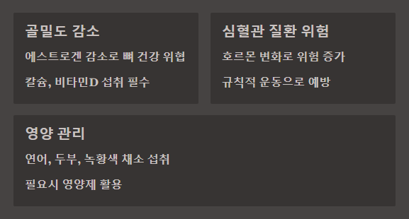 에스트로겐이 줄어들면 골밀도 감소와 심혈관 질환 위험이 함께 올라가요. 칼슘, 비타민D 섭취는 필수고, 햇볕을 자주 쬐는 것도 뼈 건강에 도움을 줘요. 연어, 두부, 녹황색 채소 등은 자연스럽게 챙기면 좋고, 필요시 건강기능식품이나 영양제를 활용해 볼 수도 있어요.