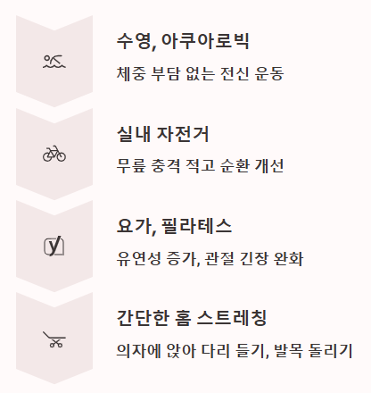 • 수영, 아쿠아로빅: 체중 부담 없이 전신 운동 가능