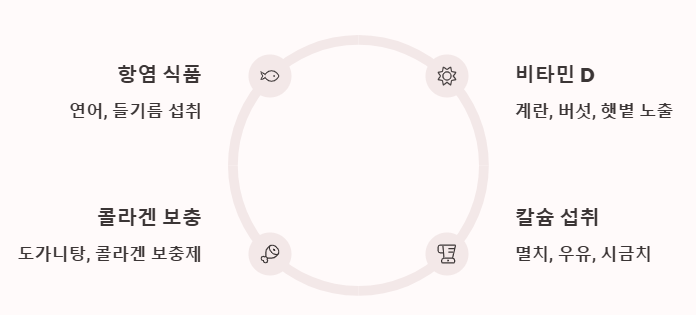 비타민 D뼈 건강, 염증 조절계란, 버섯, 강화 두유, 햇볕 노출