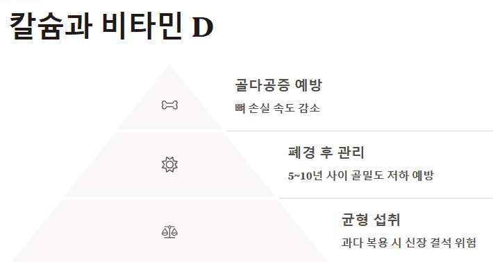 주의점: 칼슘만 과다 복용하면 신장 결석 위험이 있으니 균형 있게 섭취해야 해요.