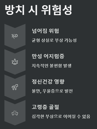 특히 고령층에서는 넘어짐이 심각한 부상(골절 등)으로 이어질 수 있어 더욱 주의가 필요해요.