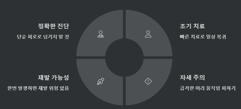 👉 고개를 급격히 돌리는 행동이나 높은 곳에 머리를 숙이는 자세는 피하는 것이 좋아요.