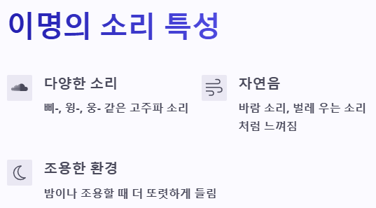 '삐-', '윙-', '웅-' 같은 고주파성 소리가 대표적이지만, 경우에 따라 바람 소리, 기계음, 벌레 우는 소리처럼 다양하게 느껴질 수 있어요.