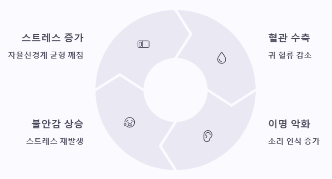 스트레스는 몸의 자율신경계 균형을 깨뜨리고, 혈관 수축을 유발해 귀로 가는 혈류를 감소시킬 수 있어요.