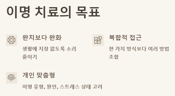 이명은 완치가 쉽지 않은 만성 증상으로, 치료의 목적은 '없애는 것'보다는 생활에 지장이 없도록 소리를 줄이고 적응하는 것이에요. 그래서 이명 치료는 한 가지 방식보다는 복합적인 방법을 함께 적용하는 것이 효과적이에요.