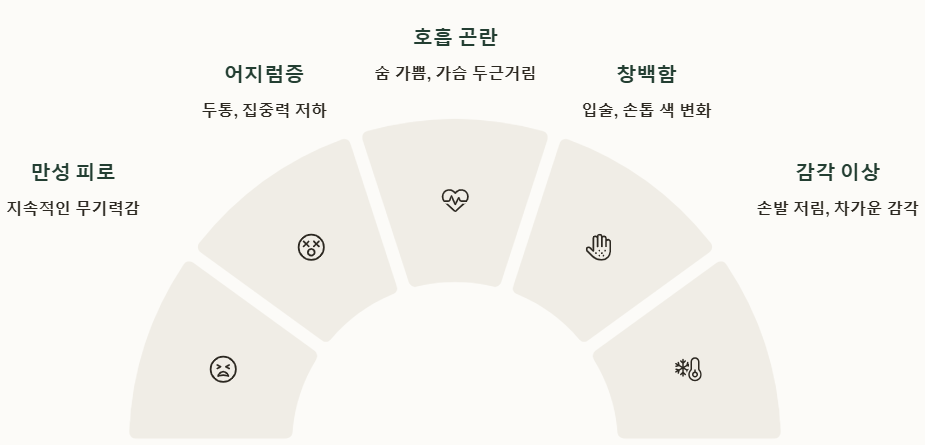 빈혈로 인한 피로는 단순한 피곤함과 다르게 쉽게 회복되지 않고 지속돼요. 충분히 쉬었음에도 무기력감이 계속되고, 약간만 움직여도 숨이 차거나 심장이 빨리 뛰는 경우가 많아요.