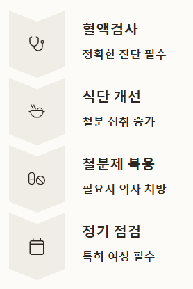 철분 섭취를 포함한 식단 개선, 필요시 철분제 복용 등을 통해 조기에 대응하면 빈혈로 인한 심각한 합병증을 막을 수 있어요.
