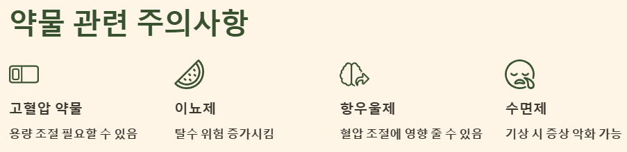 - 충분한 수분 섭취와 소금 섭취 조절