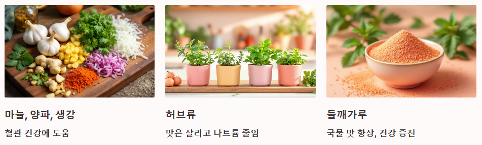 국이나 찌개는 국물 섭취를 줄이고, 간은 최소화하는 게 좋아요. 소금 대신 마늘, 양파, 생강, 허브, 들깨가루 등을 활용하면 맛도 살리고 건강도 챙길 수 있어요.