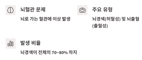 그중에서도 뇌경색은 전체 뇌혈관질환의 약 70~80%를 차지할 만큼 발생 빈도가 높고, 중장년층 이상의 연령대에서 특히 많이 발생해요.