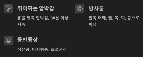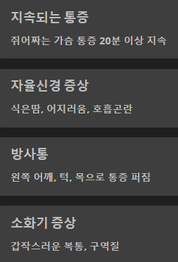 30분 이상 지속되는 통증, 갑작스러운 식은땀, 어지럼증, 호흡곤란도 함께 동반되면 의심해봐야 합니다.