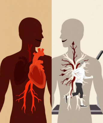 움직이지 않으면 혈액 순환이 나빠지고, 중성지방과 체지방이 축적되어 동맥경화를 촉진하게 됩니다. 특히 복부비만은 내장지방이 많을수록 심근경색 위험이 높아진다는 연구가 많아요.