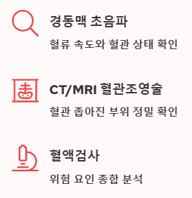 - 경동맥 초음파 검사: 목에 초음파를 대고 혈류 속도와 혈관 상태를 확인