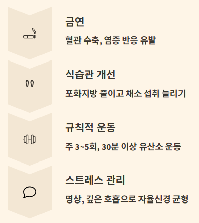 - 금연: 흡연은 혈관을 수축시키고 염증 반응을 유발해 플라크를 가속화합니다.