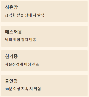심장에 급격한 혈류 장애가 생기면 뇌는 자율신경계를 통해 위험을 감지합니다. 이때 식은땀, 메스꺼움, 현기증, 불안감 같은 증상이 동반될 수 있어요.