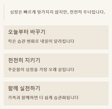 오늘부터 바꾸면, 내일이 달라집니다. 그만큼 천천히 지키는 습관이 심장을 가장 오래 살립니다.