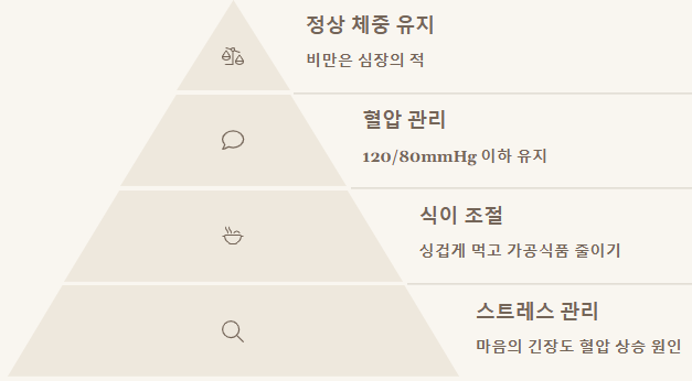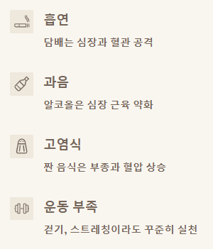 • 운동 부족: 걷기, 스트레칭이라도 꾸준히 실천하면 심장의 부담을 줄여줍니다.