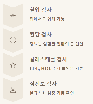 • 혈압 검사: 집에서도 쉽게 가능하며, 고혈압 조기 발견에 중요