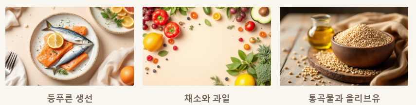 • 연어, 고등어 등 등 푸른 생선: 오메가-3 지방산이 풍부해 혈관 건강에 도움