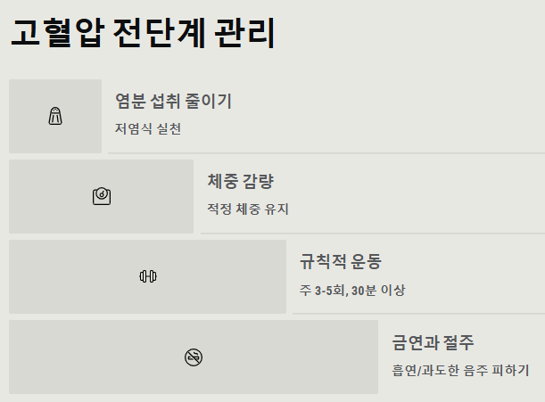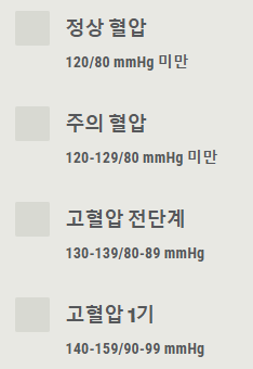 | 고혈압 2기 | ≥ 160 | 또는 | ≥ 100 |