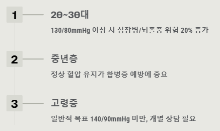 - 20~30대: 이 연령대에서 130/80mmHg 이상의 혈압이 나오면 심장병이나 뇌졸중 위험도가 20% 정도 올라간다는 연구 결과도 있습니다. 젊다고 방심하지 말고, 꾸준히 혈압을 확인하고 관리해야 합니다.