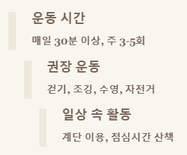 - 실천 팁: 매일 30분 이상, 주 3~5회 걷기, 조깅, 수영, 자전거 타기 등 중간 강도의 유산소 운동을 꾸준히 하세요. 엘리베이터 대신 계단을 이용하거나, 점심시간에 산책하는 등 일상생활 속 활동량을 늘리는 것도 좋습니다.