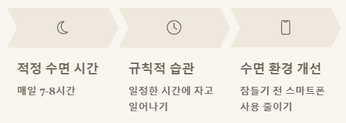 - 실천 팁: 매일 7~8시간의 충분한 수면을 취하도록 노력하세요. 규칙적인 수면 습관을 만들고, 잠들기 전 스마트폰 사용을 줄이는 등 수면 환경을 개선하는 것이 중요합니다.