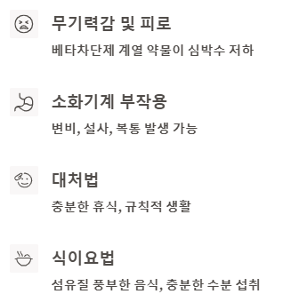 - 대처법: 변비가 있다면 섬유질이 풍부한 음식과 충분한 수분을 섭취하고, 규칙적인 운동을 합니다. 증상이 지속되면 의사와 상담하여 약 변경을 고려할 수 있습니다.