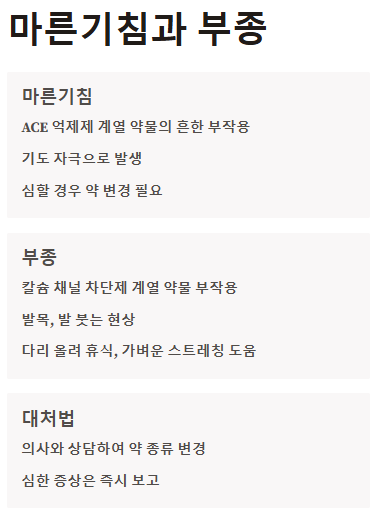 - 대처법: 마른기침이 지속되거나 생활에 불편함을 줄 정도로 심하다면, 의사와 상담하여 약의 종류를 다른 계열로 변경할 수 있습니다. 약 변경 후 대부분 호전됩니다.