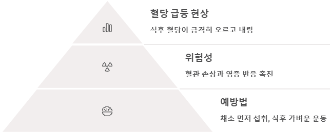 👉 혈당 스파이크는 식사 후 혈당이 급격하게 치솟았다가 다시 급격히 떨어지는 현상을 말합니다. 혈당이 정상인 사람에게도 나타날 수 있지만, 특히 당뇨병 전단계나 당뇨병 환자에게 자주 발생하며, 혈관 손상과 염증 반응을 촉진하여 당뇨병 합병증 위험을 높일 수 있습니다. 혈당 스파이크를 예방하려면 정제 탄수화물 섭취를 줄이고, 식이섬유가 풍부한 채소를 먼저 먹고, 식후 가볍게 걷는 습관을 들이는 것이 중요합니다.