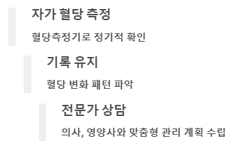 - 스트레스는 혈당을 높이는 호르몬 분비를 촉진합니다. 명상, 요가, 취미 활동 등으로 스트레스를 관리하고, 하루 7~8시간의 충분한 수면을 취하는 것이 중요합니다.