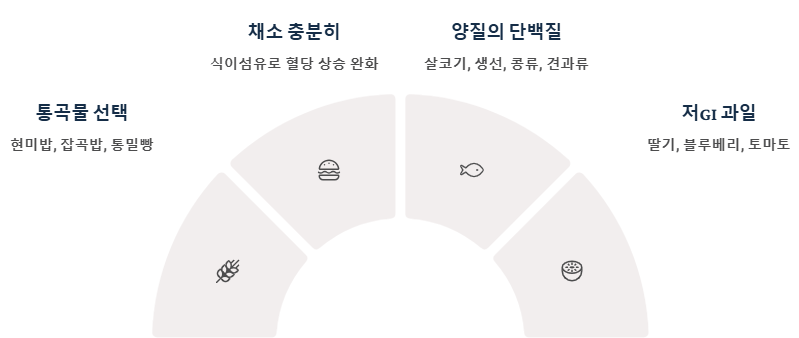 - 단백질과 건강한 지방: 살코기, 생선, 콩류, 견과류 등 양질의 단백질과 불포화지방산을 섭취하여 혈당 관리에 도움을 줍니다.
