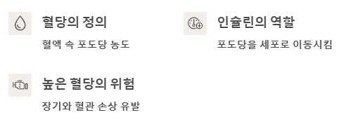 혈당은 혈액 속에 포함된 포도당의 농도를 말합니다. 우리 몸의 세포가 활동하는 데 필요한 주된 에너지원이 바로 포도당인데요. 췌장에서 분비되는 인슐린이라는 호르몬이 이 포도당을 세포 안으로 잘 들어가게 조절하는 역할을 합니다.