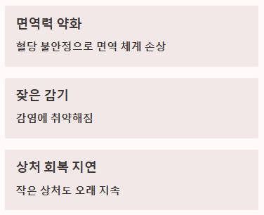 혈당이 높고 불안정하면 면역력이 약해져 감염에 취약해지고, 상처가 잘 낫지 않을 수 있습니다. 잦은 감기나 피부 트러블, 작은 상처가 오래가는 등의 증상이 나타난다면 혈당 스파이크가 면역 체계에 영향을 미치고 있을 가능성도 있습니다.