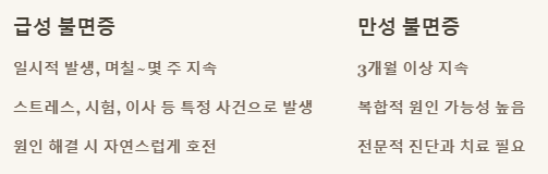 - 만성 불면증: 수면 문제가 최소 3개월 이상 지속될 때 진단해요. 이는 단순한 스트레스 외에 더 복합적인 원인(신체 질환, 심리적 요인, 부적절한 수면 습관 등)이 있을 가능성이 높아요. 꾸준하고 전문적인 진단과 치료가 필요한 경우가 많답니다.