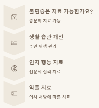 👉 네, 불면증은 충분히 치료가 가능합니다. 생활 습관 개선(수면 위생), 인지 행동 치료, 약물 치료 등 다양한 방법이 있으며, 전문의와의 상담을 통해 자신에게 맞는 치료법을 찾으면 충분히 극복할 수 있습니다. 포기하지 않고 적극적으로 대처하는 것이 중요합니다.