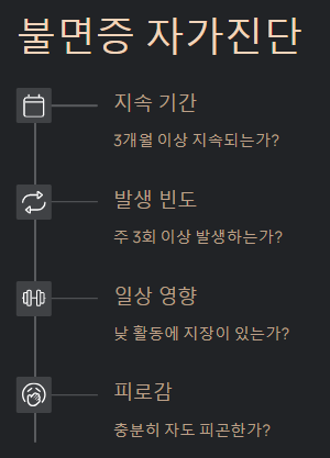 - 수면의 질 저하: 충분히 잠을 잤다고 생각했는데도 개운하지 않고, 낮 동안 피로감이 계속될 때도 불면증의 신호일 수 있어요.