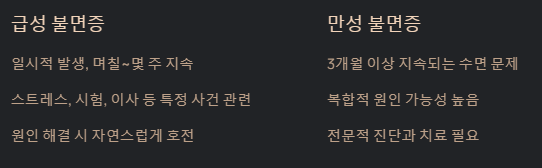 - 만성 불면증: 수면 문제가 최소 3개월 이상 지속될 때 진단해요. 이는 단순한 스트레스 외에 더 복합적인 원인(신체 질환, 심리적 요인, 부적절한 수면 습관 등)이 있을 가능성이 높아요. 꾸준하고 전문적인 진단과 치료가 필요한 경우가 많답니다.