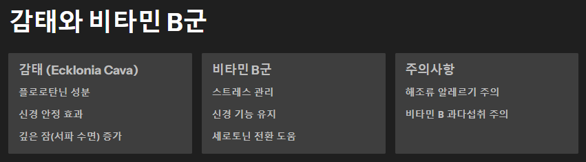 - 효능: 최근 주목받는 수면 영양제 성분입니다. 감태에서 추출한 플로로탄닌 성분이 신경 안정 효과를 통해 수면의 질을 개선하고, 특히 깊은 잠(서파 수면)을 늘리는 데 도움을 줄 수 있다고 알려져 있습니다.