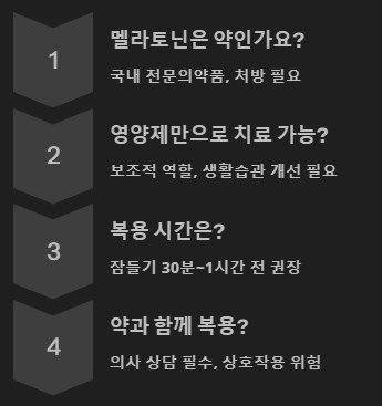 👉 국내에서는 멜라토닌이 전문의약품으로 분류되어 의사의 처방이 있어야만 구매할 수 있습니다. 해외에서는 영양제로 판매되는 경우가 많아 혼동할 수 있지만, 국내 기준으로는 약이라는 점을 인지해야 합니다. 반드시 의사와 상담 후 처방받아야 합니다.